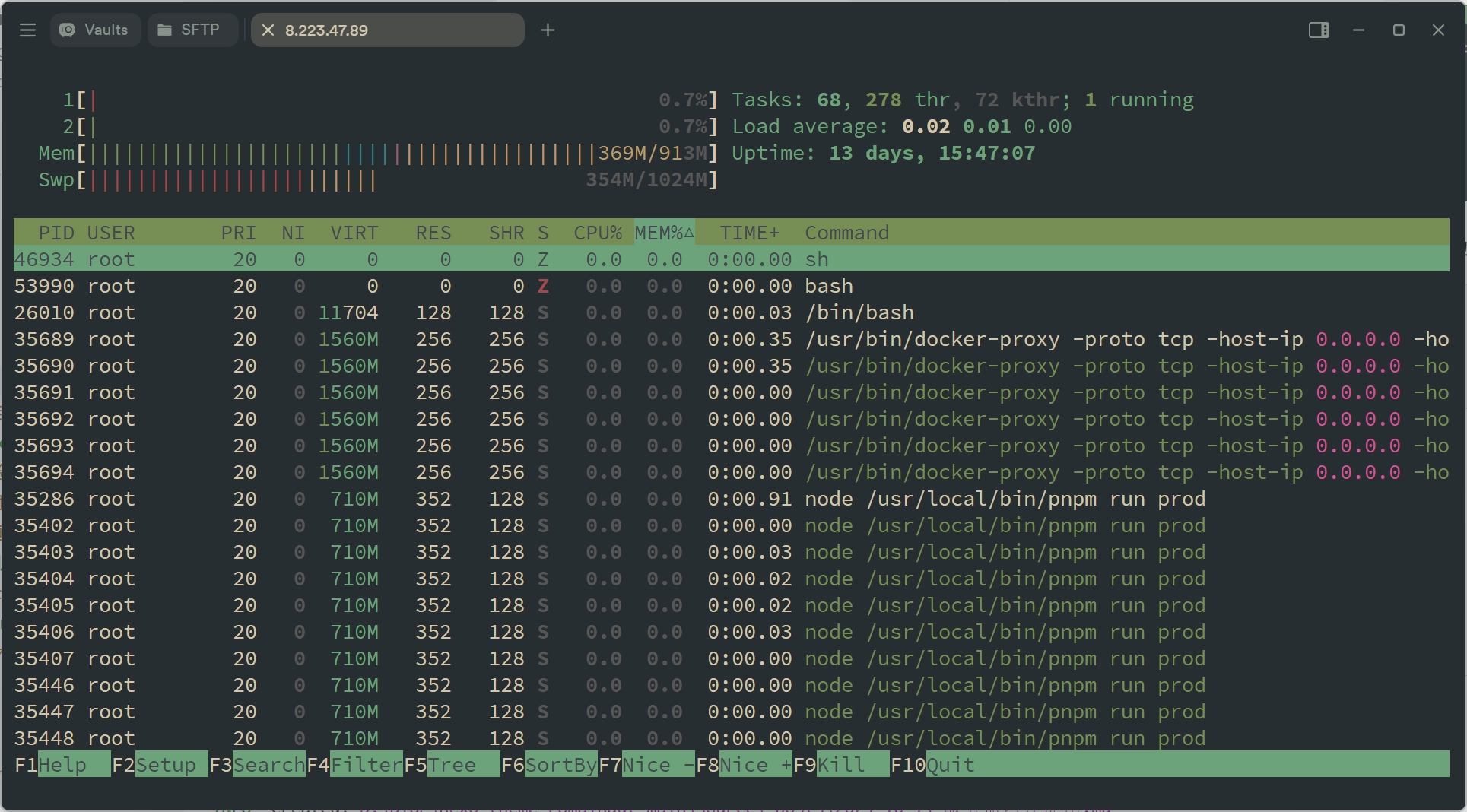 可以使用free -m来查看内存使用情况,这边推荐一个更好用的工具htop: