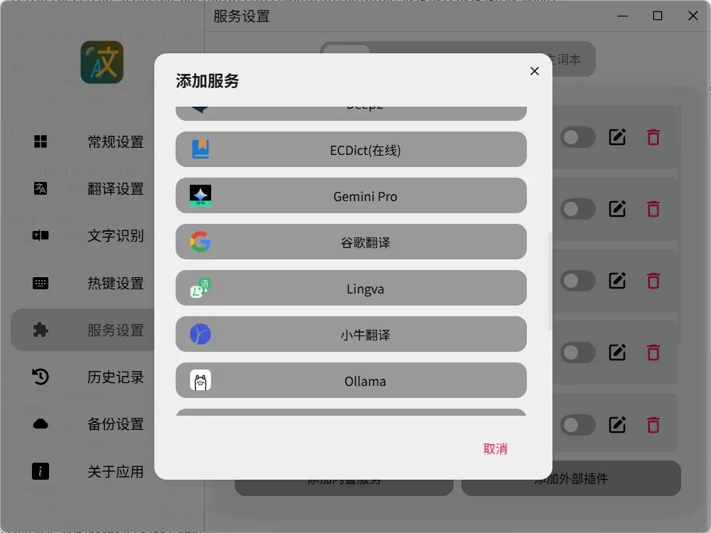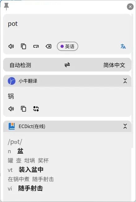 跨平台的翻译软件,支持的翻译api很全,支持滑词翻译,截图翻译。