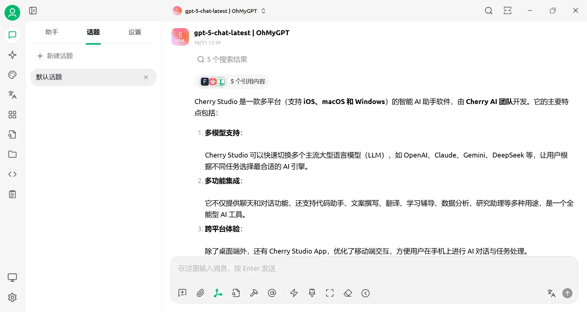 AI集成前端。实现了知识库,MCP,智能体,联网搜索等常用功能,虽然不一定是最好的,但作为一个前端的套壳工具,美观,省心是最重要的。而且更新也比较勤快,缺点是内存占用较高。