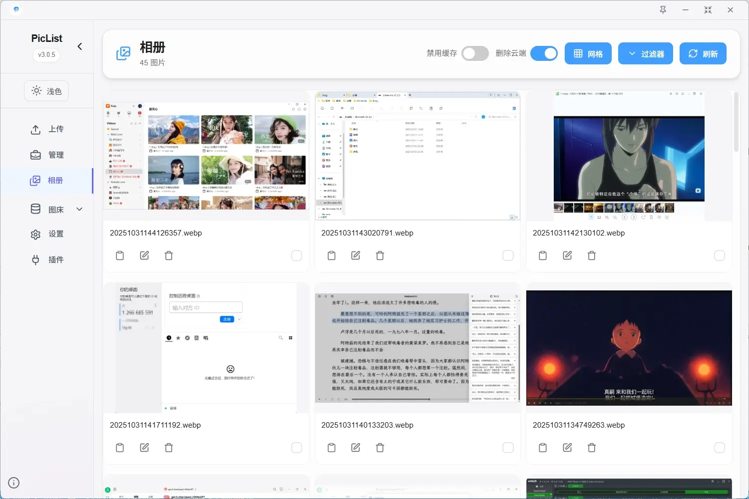 图床管理工具。我的流程是,pixpin截图并复制,使用快捷键上传到piclist,使用tinypng插件进行压缩(不在乎大小也可以不压缩),然后返回一个markdown格式的图床链接。相比picgo,它可以同步删除云端,这个功能十分好用。
