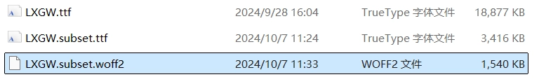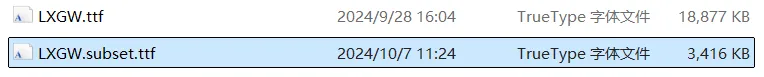 然后就会得到图片所示的subset结尾的编码压缩后的ttf文件,体检体积已经从18MB下降到3MB。