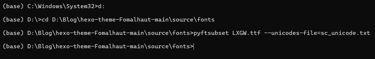 将你要压缩的字体ttf文件和刚刚下载的sc_unicode.txt编码文件放进去同一个文件夹,进入到该文件夹的控制台如下命令然后回车。